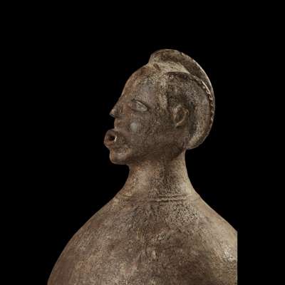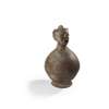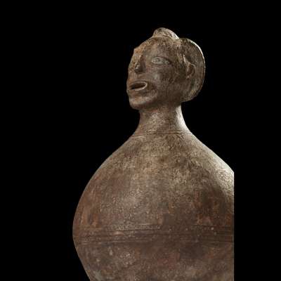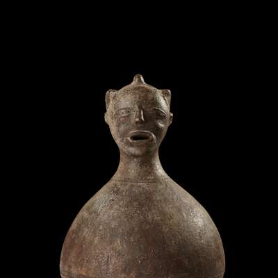 pottery, sitting on a ring base, the body of globular form with short neck terminating in a human head with the mouth acting as a spout