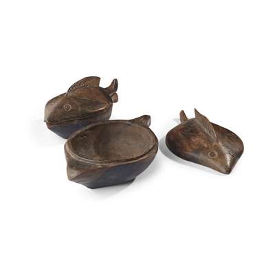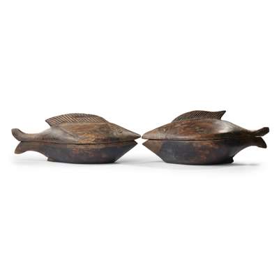 carved wood, a pair of lidded recepticles in the form of fish, with raised fins, ring eyes and incised decoration around the mouths (2)