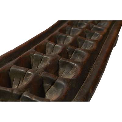carved wood and cord, standing on four squat legs with a series of recesses for the gaming pieces, good wear from use