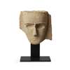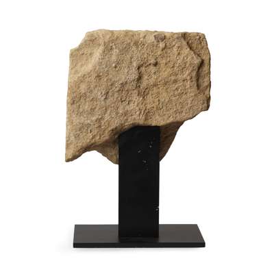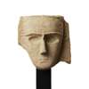 limestone, the head of a man carved in relief, with closed mouth, angular nose merging into the brow and reccessed almond eyes, mounted