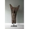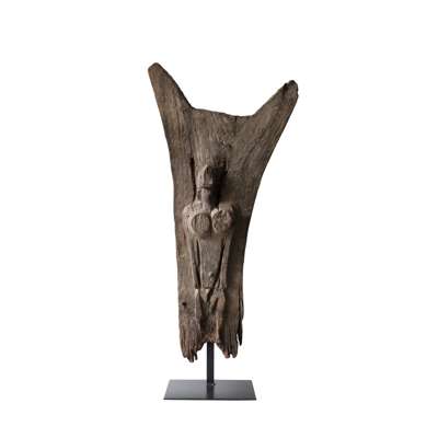 carved wood, the forked support above a depiction of a female carved in releif with the arms held to the side, raised on a bespoke mount