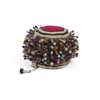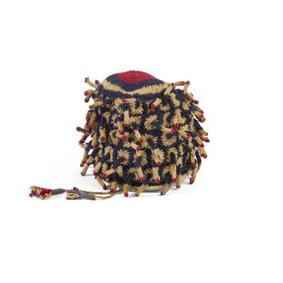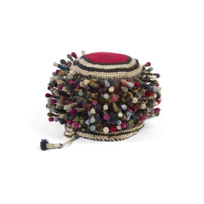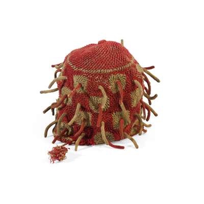 Hats and headdresses in this distinctive style began to emerge in the Grassfields region of Cameroon around the turn of the 20th century. Traders from northern Nigeria introduced embroidered hats to the area which hid the elaborate hairstyles of twisted strands of hair worn by men. Here, the burls or "dreads" are created by crocheting over individual wooden pegs which imitate these ornate styles.