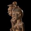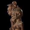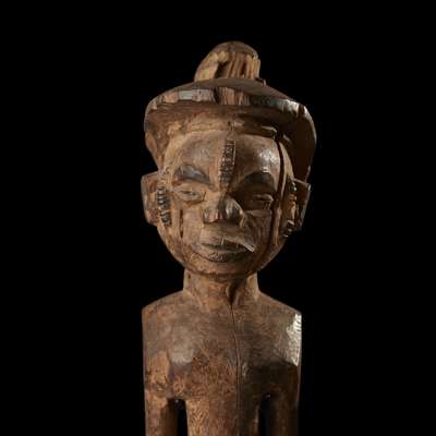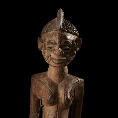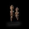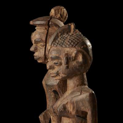 carved wood, the male with truncated phallus, the arms carved free of the body, with a hat, the female with a coiffure above bent arms resting on a protruding abdomen, both with expressively carved facial features and elaborately rendered scarification, with fragmentary legs, old patina, on a metal stand