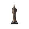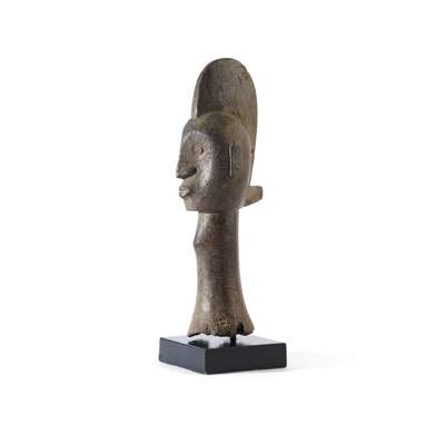 carved wood, a tall neck leading to the head with pursed lips, slender nose and ring eyes, an elaborate crest or coiffure above