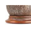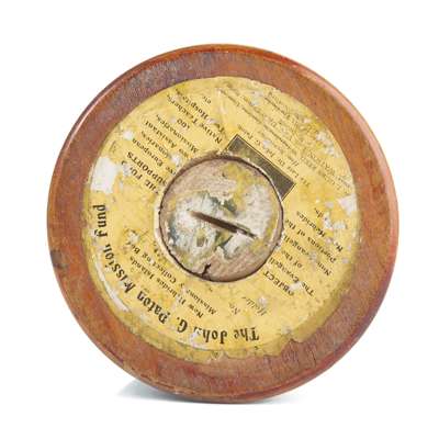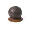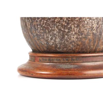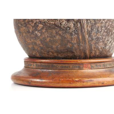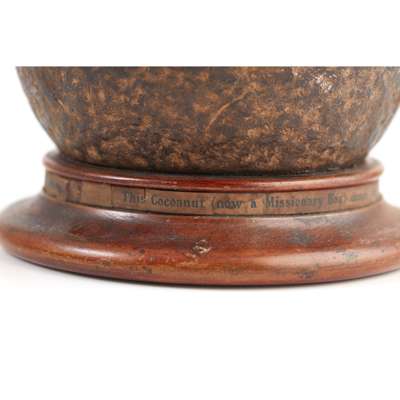 coconut with a perforation for the insertion of coins, mounted to a wooden stand with an inscription running along the side reading as follows "This cocoanut [sic] (now a Missionary Box) comes from A...a [Aniwa], New Hebrides, S.W. Pacific ... cannibalism through the labours of Dr. John G. Paton"