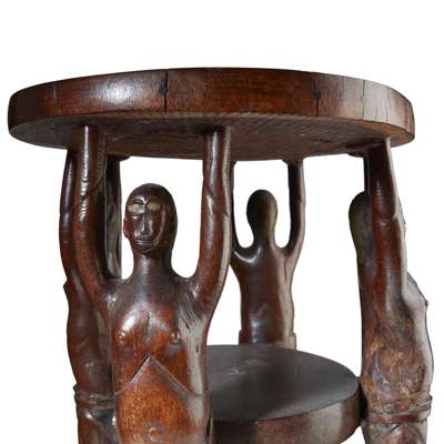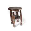carved wood, the circular seat held up by four finely carved figures with inlaid eyes, wearing loincloths and standing on plinth bases