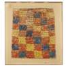 textile and feather, likely a fragment from a larger burial poncho, with a checkerboard design of alternating red, yellow and blue squares, framed