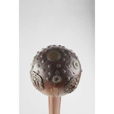 carved wood and metal, of classic form with a long shaft and bulb head, inset with metal tacks, nails and British military insignia
