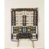 beaded leather, with a bar top, the square hide decorated with horizontal and vertical rows of white and multicoloured beads in geometric motifs and a central row of tassles, framed