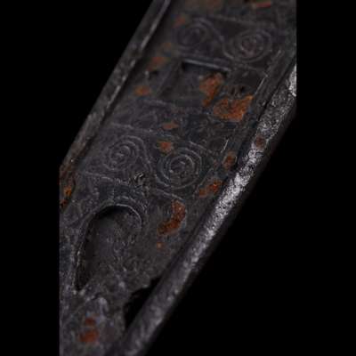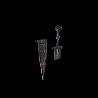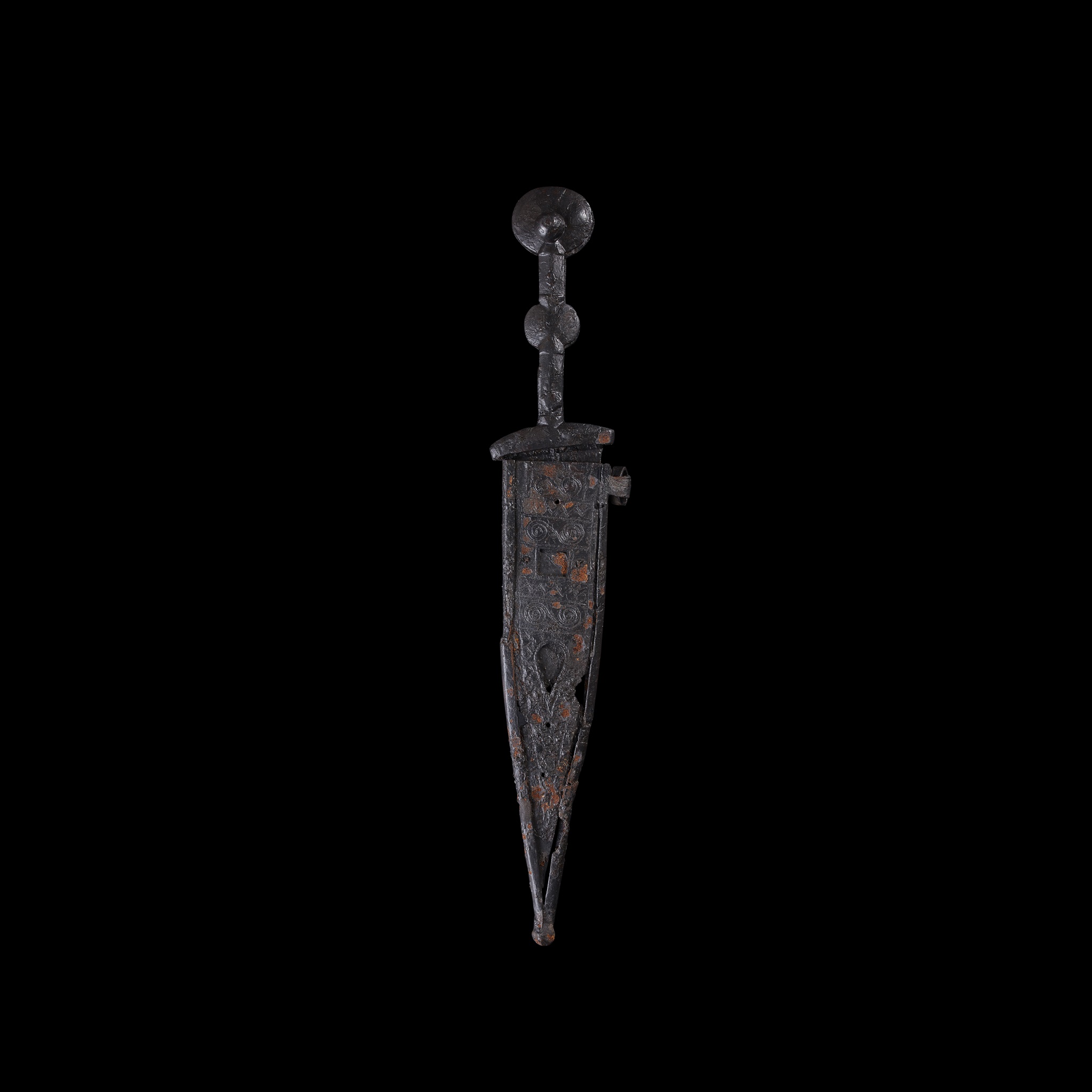 cast iron, the handle formed of two sections, held together by joints inserted into discs at the centre and pommel, the blade of tapering form with median midrib, the scabbard of "frame-type" with one open side and the other decorated with double-spiral motifs and openwork panels