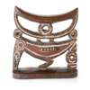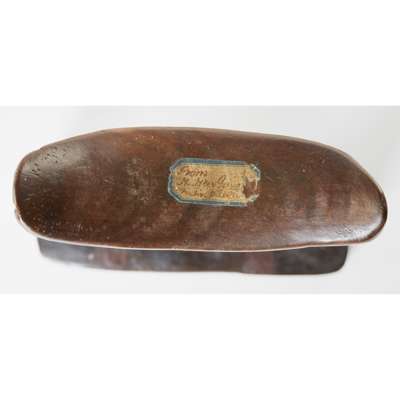 carved wood, standing on a flat rectangular base with a bird (possibly a hornbull) support beneath a curved pillow, bearing a nineteenth century label reading "From N. New Guinea native pillow" and a separate metal bordered paper tag in common usage through the mid to late nineteenth century, details accentuated with lime