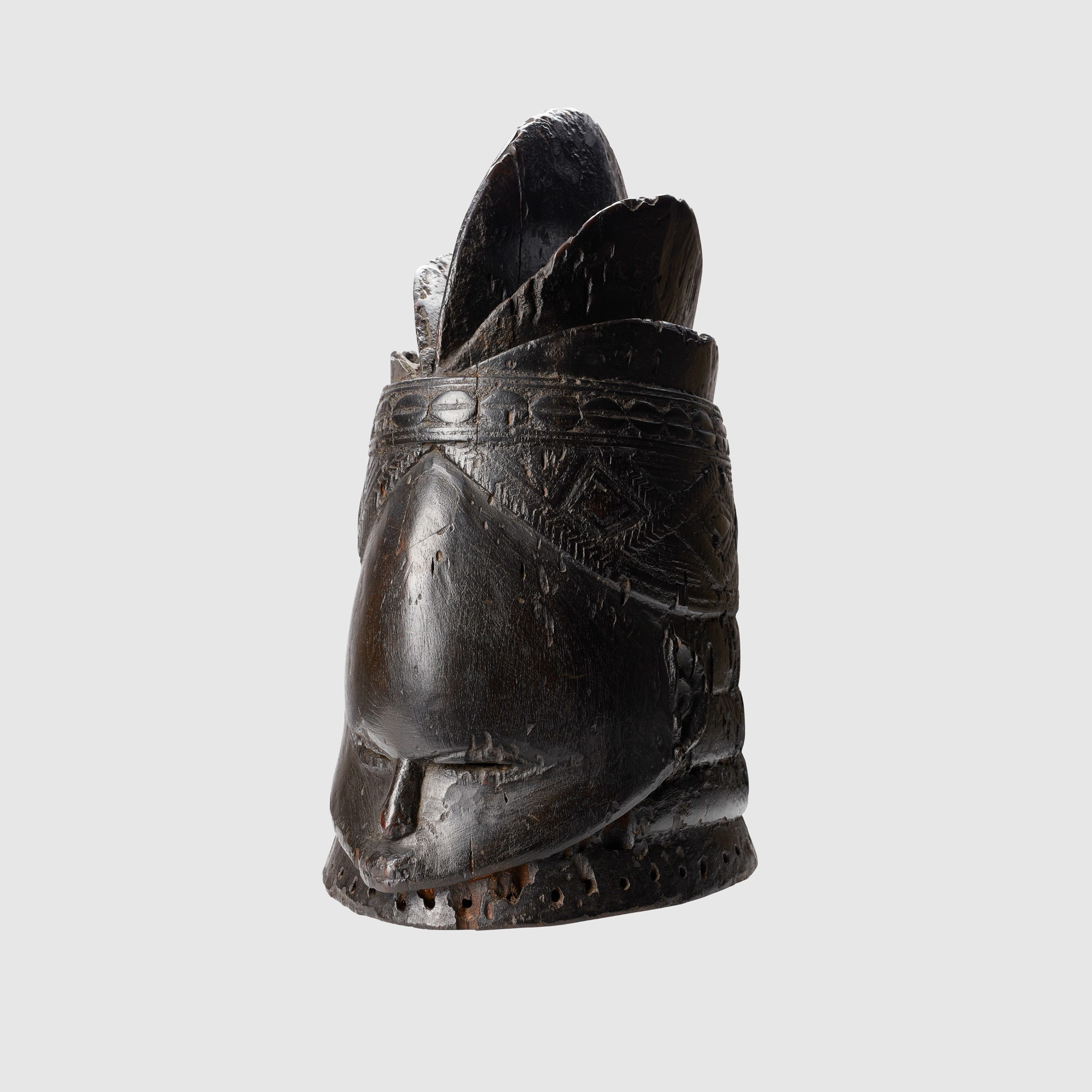 carved wood, with high coif above a carved cowrie shell band and rectangular panels, ridged forehead, slit eyes and ringed neck