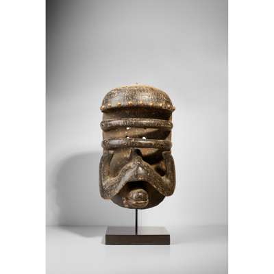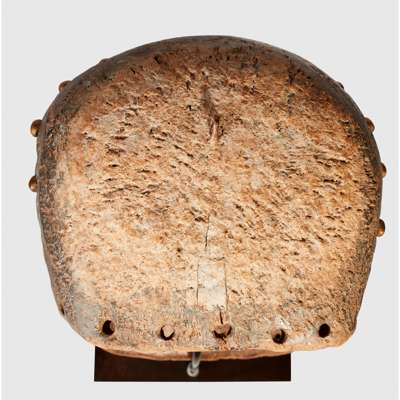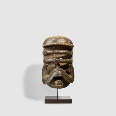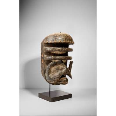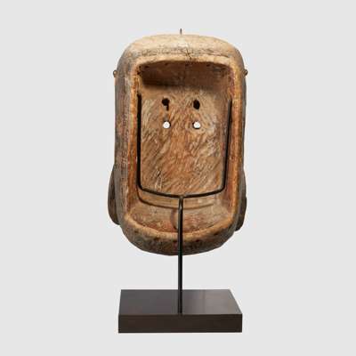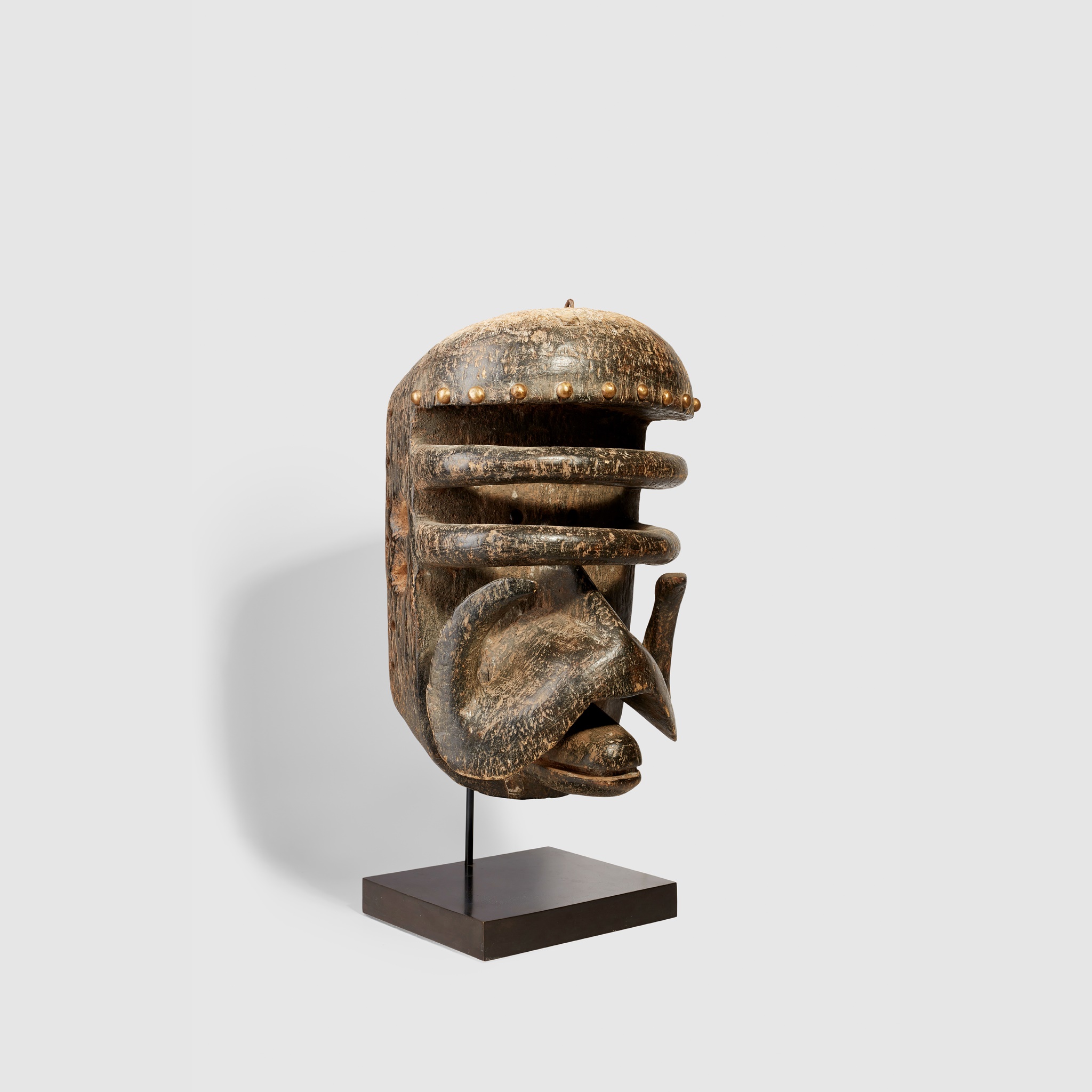 carved wood and metal, the protruding brow inset with brass tacks and with two ringed flanges below, the nose flaring outwards into two separate tusk-like appendages, the mouth balanced between, perforated at the sides for attachment, raised on a bespoke mount