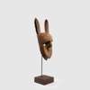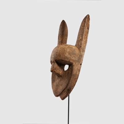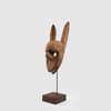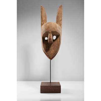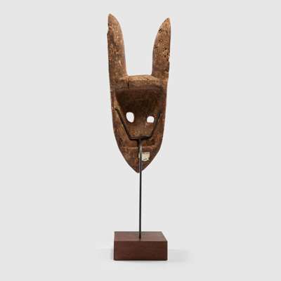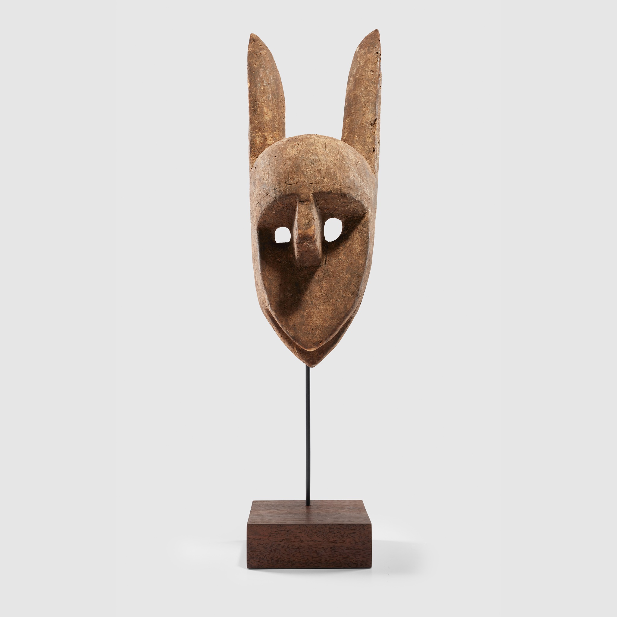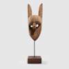 carved wood, with domed forehead, geometric nose, open maw and upright ears, thick patination and wear commensurate with age, raised on a bespoke mount
