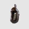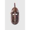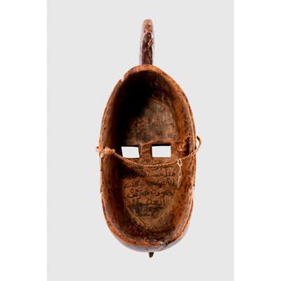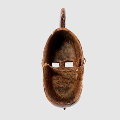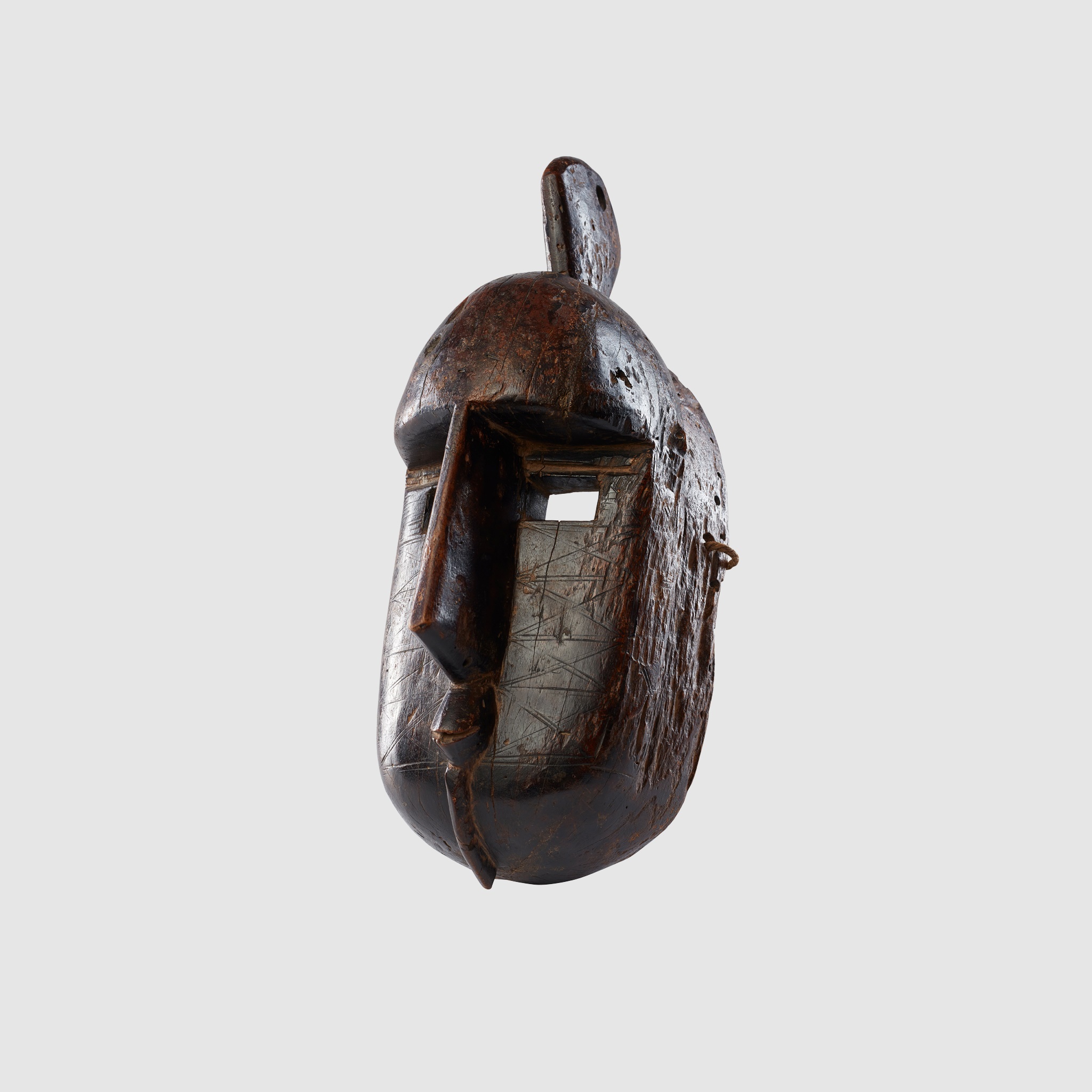 carved wood, the domed forehead with single crest above, the face deeply recessed with the square eyes parted by an angular ridged nose, pursed mouth and short beard, perforations to the sides for attachment, the reverse with an Arabic inscription