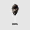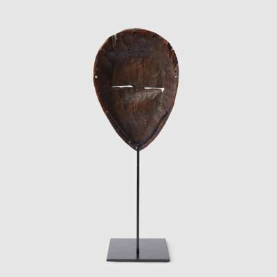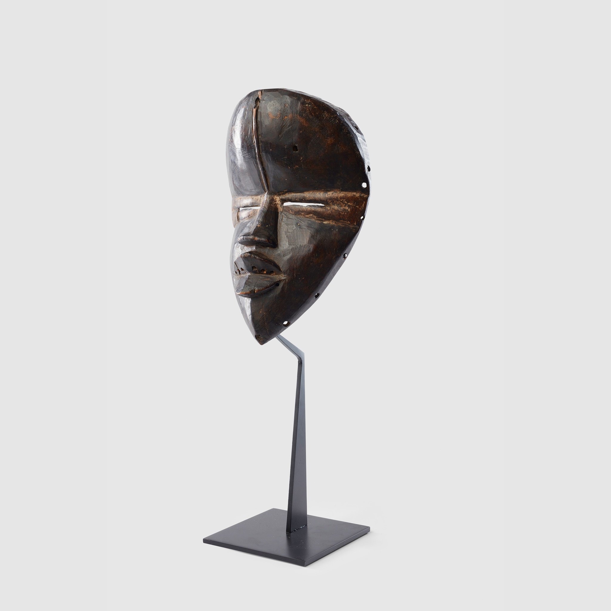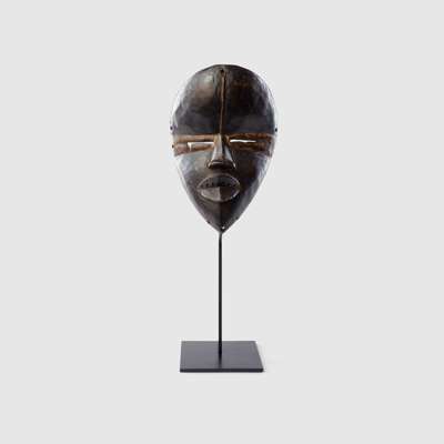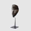 carved wood, with dome forehead receding into the perforated cut eyes, triangular nose and full lips, rich patina, raised on a bespoke mount