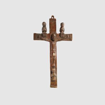 cast brass, the Christ figure at the centre of the cross is depicted with African features, he is flanked by three smaller figures, all with their hands in prayer