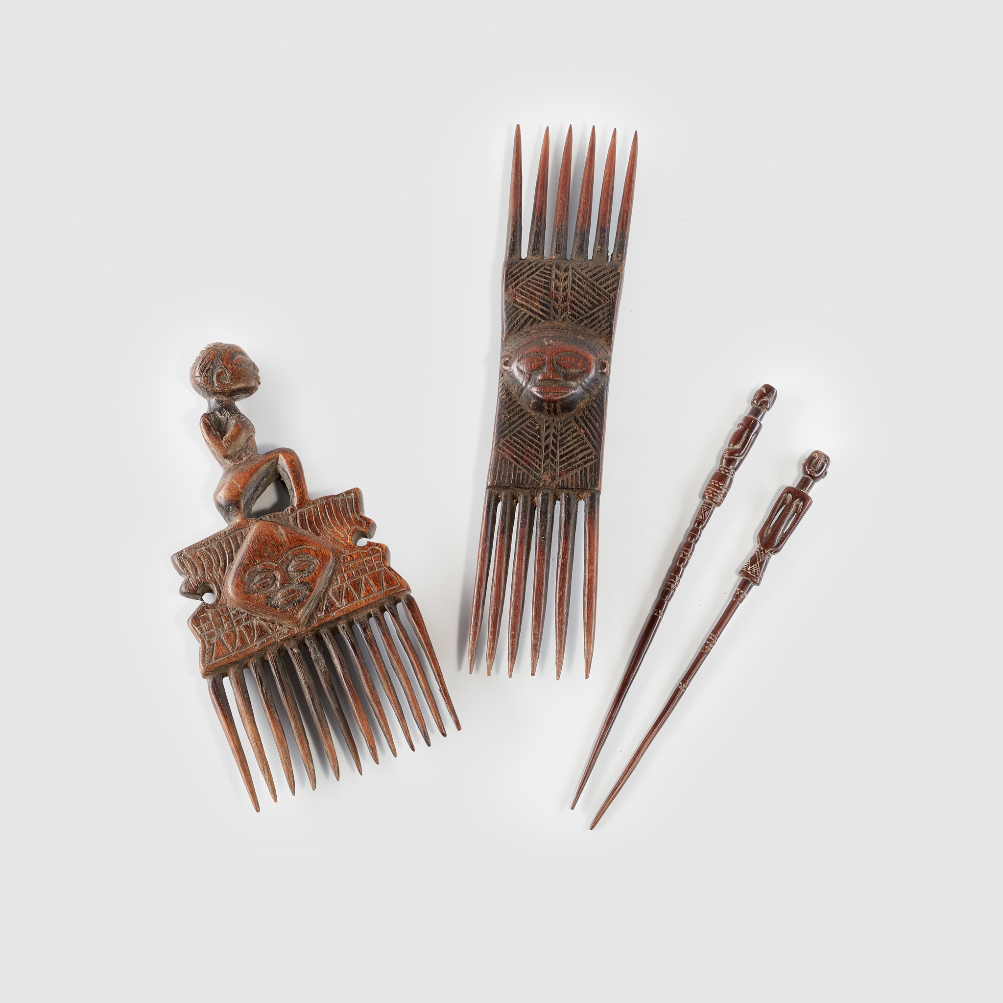 carved wood, comprising; a Chokwe double headed comb with central carved face; a Chokwe comb with seated female finial; a pair of Tanzanian hair pins (4)