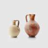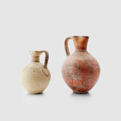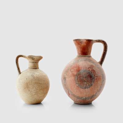 painted terracotta, comprising of; one Cypriot black on red ware jug, standing on a ring base, the body adorned with concentric circle decoration, ringed collar, trefoil lip and strap handle, the concentric circles meeting the depression of the pinched lip lend a zoomorphic appearance; one small Cypriot bichrome ware jug, with trefoil lip and strap handle, abstract depictions of birds in flight and a fish hook motif on the reverse painted in umber pigment on the cream background (2)