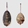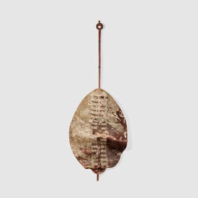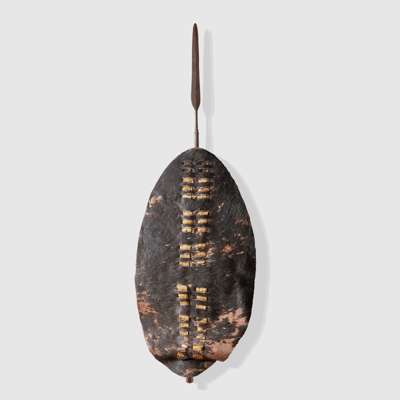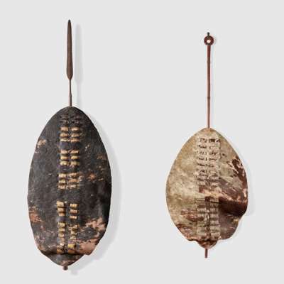 hide and wood, the first with black hair, of oval shape with two columns of small horizontal slits through which leather loops secure a central spear support bound with hide; the second with cream and brown hair, of identical construction with a distinctive pole support featuring a open circular terminal with copper binding (2)