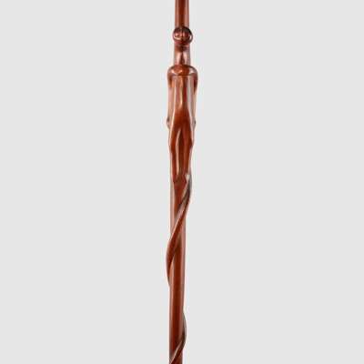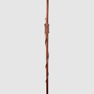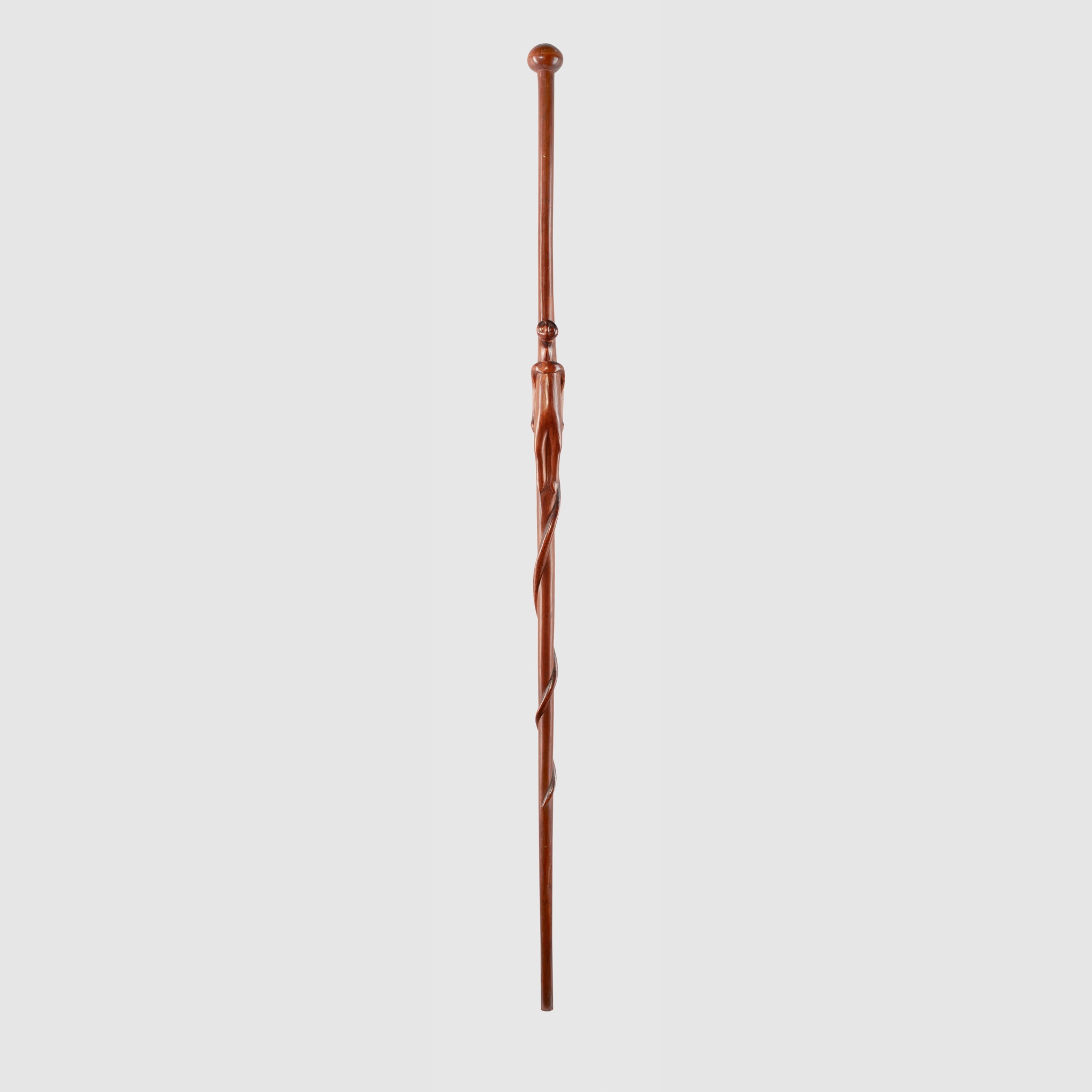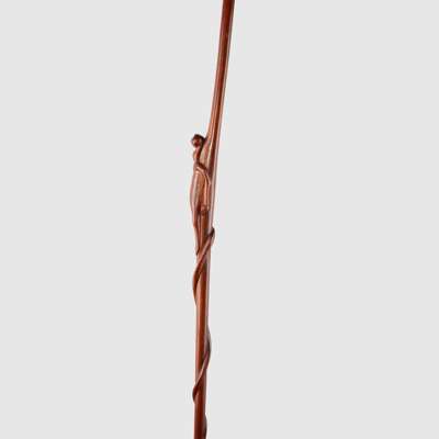 carved wood, with a serpent coiling up the shaft and meeting the figure carved at the staff's centre, the figure with a hybrid of human and snake-like features, rich caramel patina