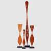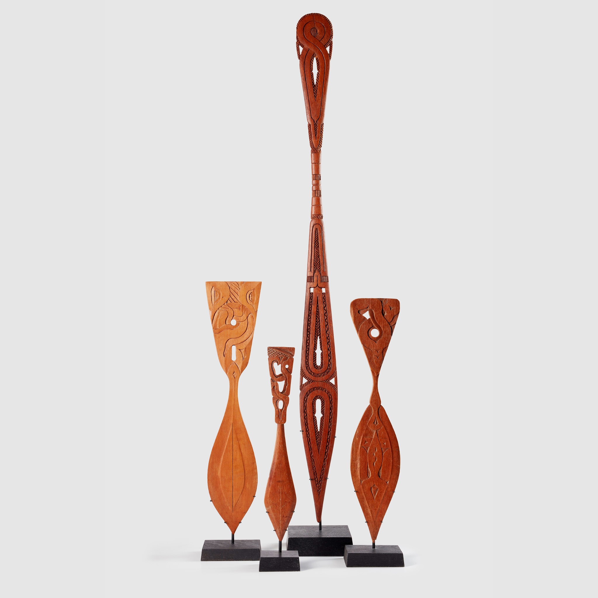 carved wood, the collection comprising of; one ceremonial paddle, with long handle terminating in an elaborate finial with twist design, the paddle blade with openwork carving; three sago stirrers, each with flowing motifs executed in low relief and leaf shaped head, all raised on bespoke mounts (4)