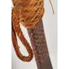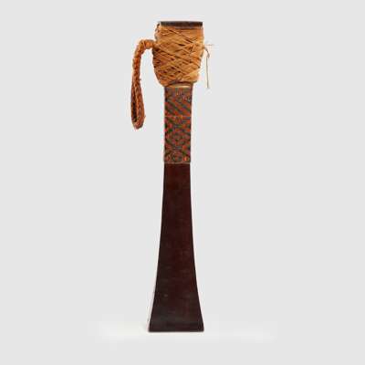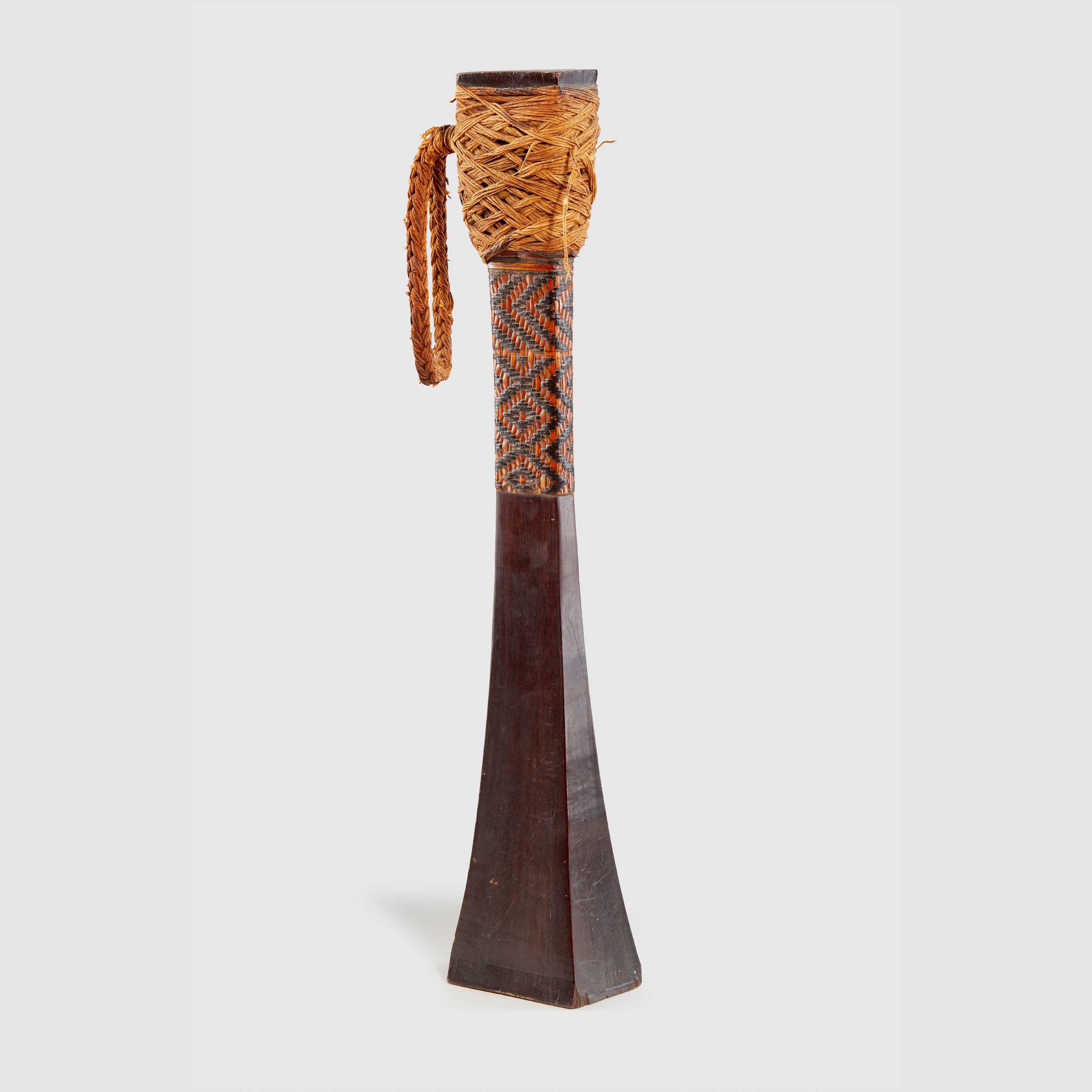 carved wood, vegetal fibre and thread, of tapering form and rectangular section, the top wound with fibre thread and a suspension loop, the handle with intricate decorative binding