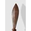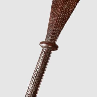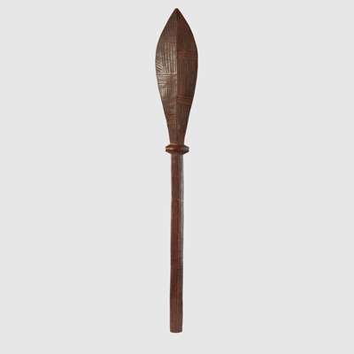 carved wood, with raised central section, the head leaf shaped, with unadorned oval section separating the long handle, covered with incised geometric decoration