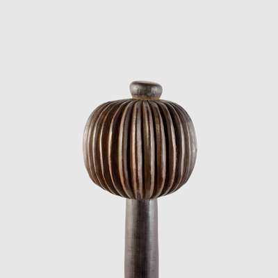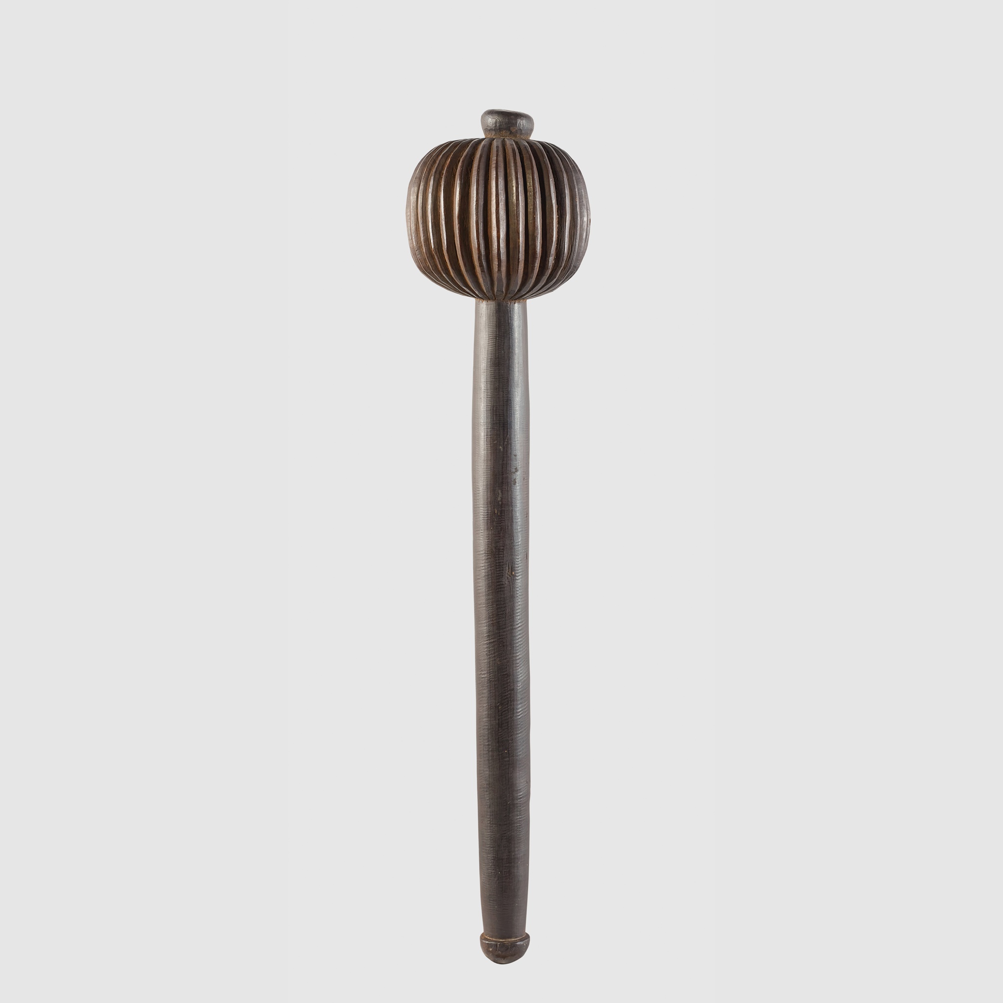 carved wood, similar to an ula throwing club in construction, yet of exceptional size and power, the bulb head with incised ridges and spherical terminal, the long handle with cap base