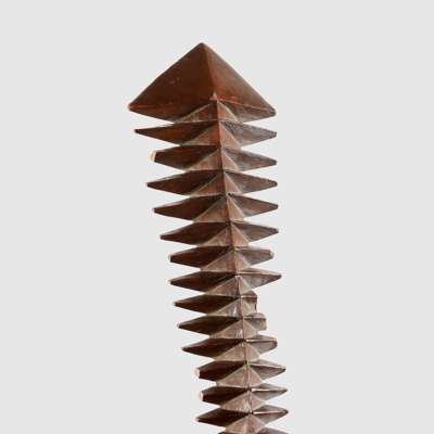 carved wood, the long handle leading to rows of carved teeth below a triangular head