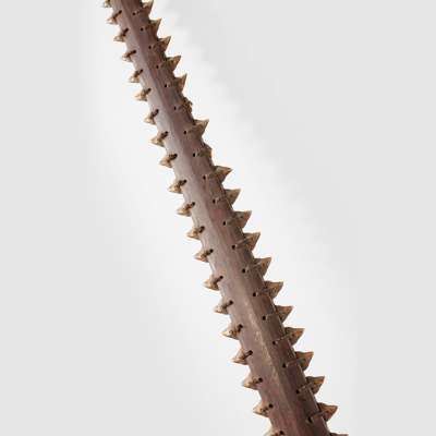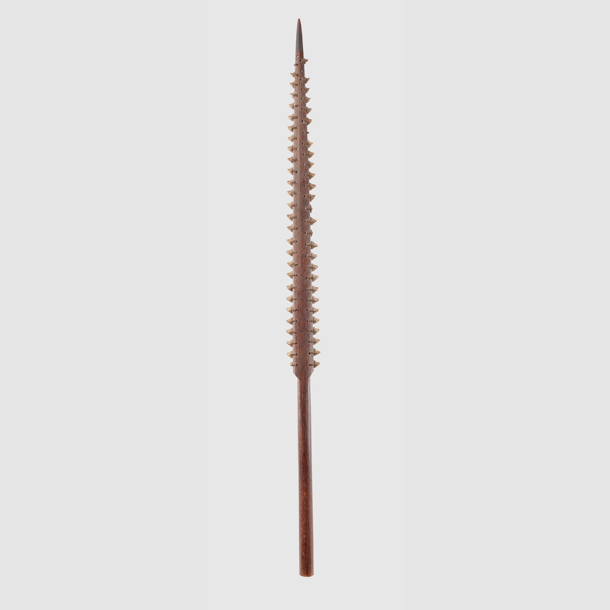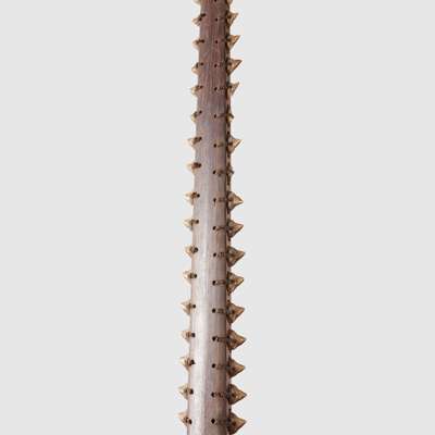 carved wood, the long tapering blade with rows of sharks teeth affixed through fibre binding