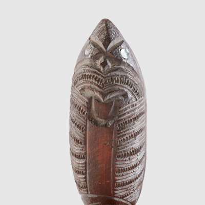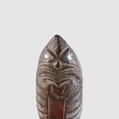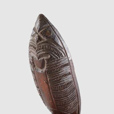 carved wood and paua shell, possibly a receptacle for tattooing ink, canoe shaped, the underside carved with notched ornamentation and a tiki finial with inlaid eyes