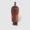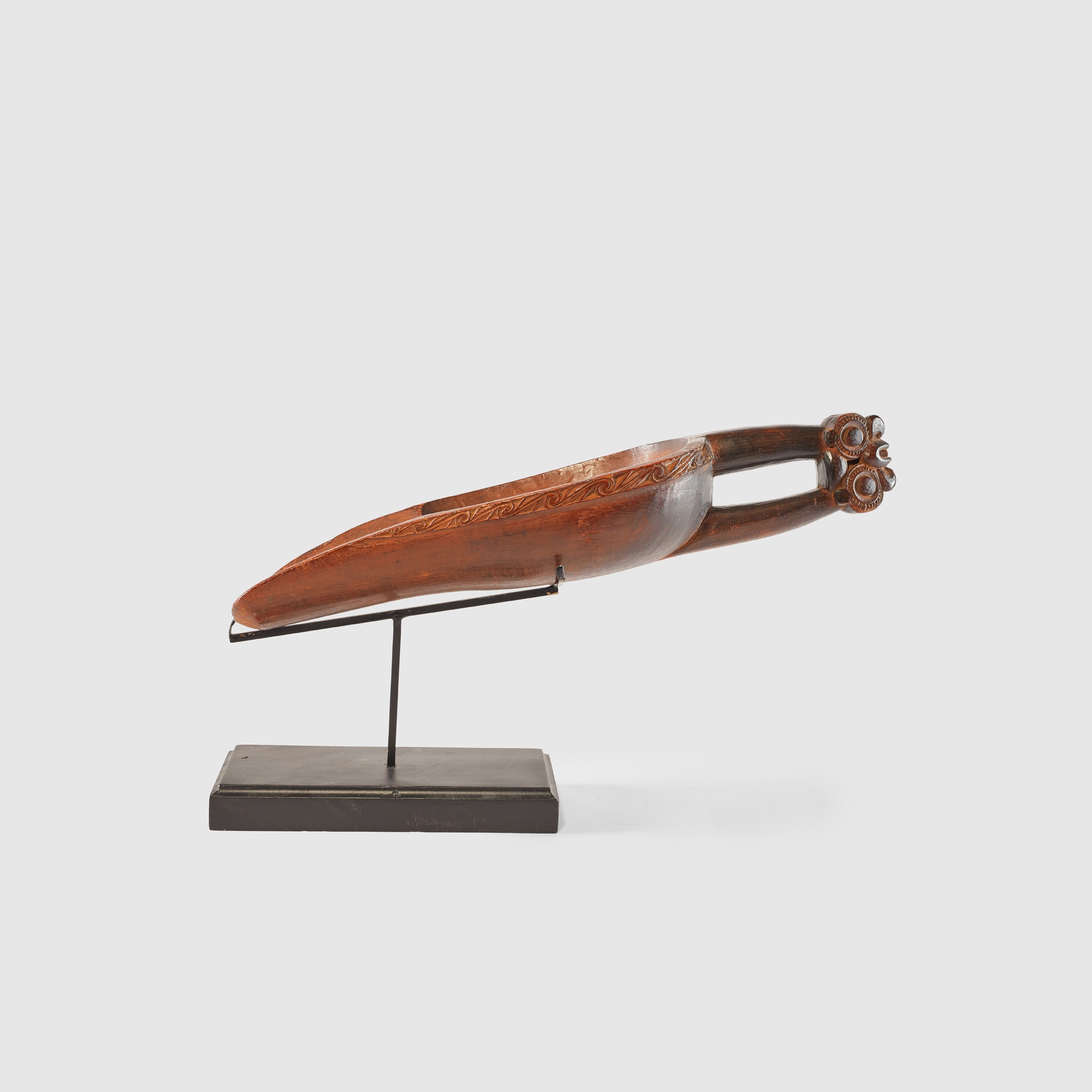carved wood, deep scoop, the upper border with incised scrolled design, the double handle with dual tiki finial, raised on a bespoke mount