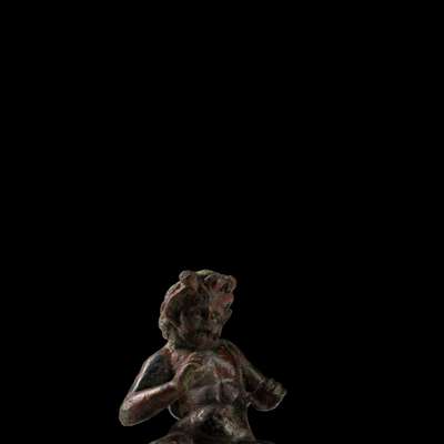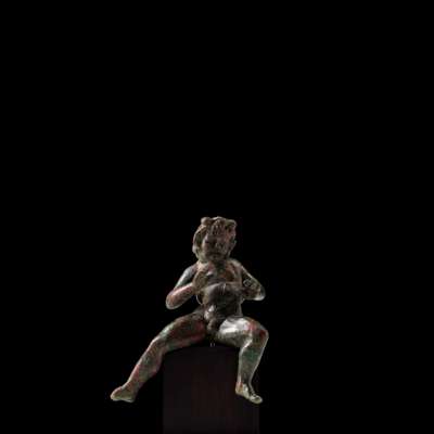 cast bronze, the satyr of strong build, shown seated, as if perched on a ledge, the arms raised perhaps to hold the aulos, the expression merry, the hair reaching down to the nape of the neck with a wreath holding it in place, raised on a bespoke mount