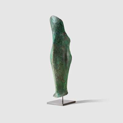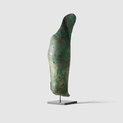 hammered bronze, the full length greave with the shins and calf muscles well modelled, raised on a bespoke mount