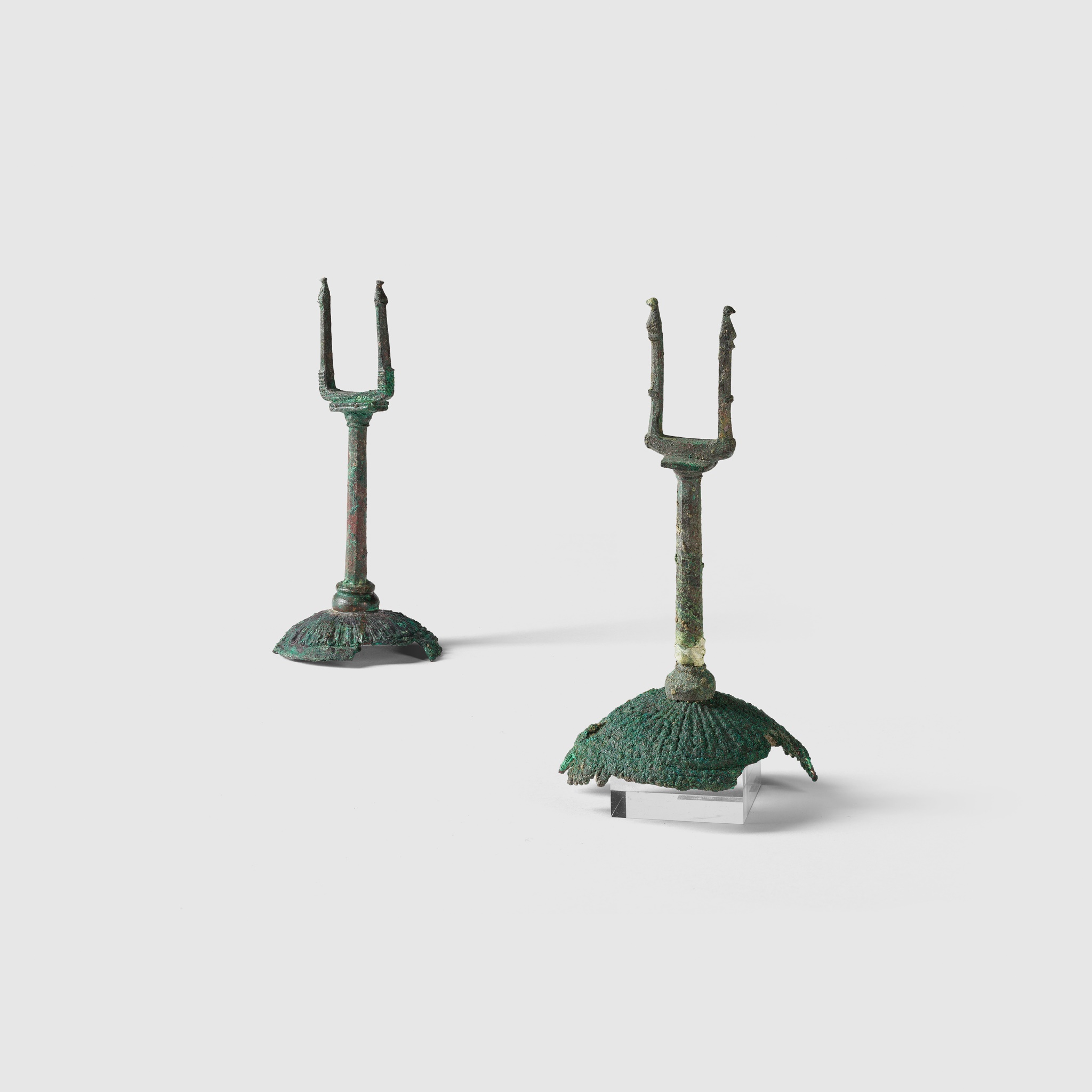cast and hammered bronze, both standing on a conical base with ridged flaring, rising to a two pronged head intended for the attachment of a crest, both with Axel Guttmann collection labels on the underside "AG 333" (2)