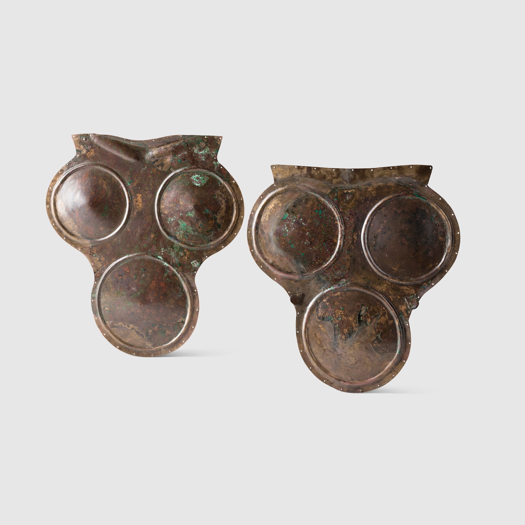 hammered bronze, set composed of a front and back plate, both with three discs set in a bronze sheet forming a triangular shape, the front plate with delineation of the clavicle above, with Axel Guttmann collection labels "AG 433" (2)