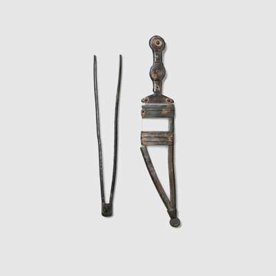 bronze, with circular pommel, the handle formed of two pieces riveted in place, without original blade, the sheath with bronze border and dual cross pieces with incised decoration, the two open central sections would once have held a leather inlay; accompanied by a second dagger sheath presented on a plexiglass mount (2)