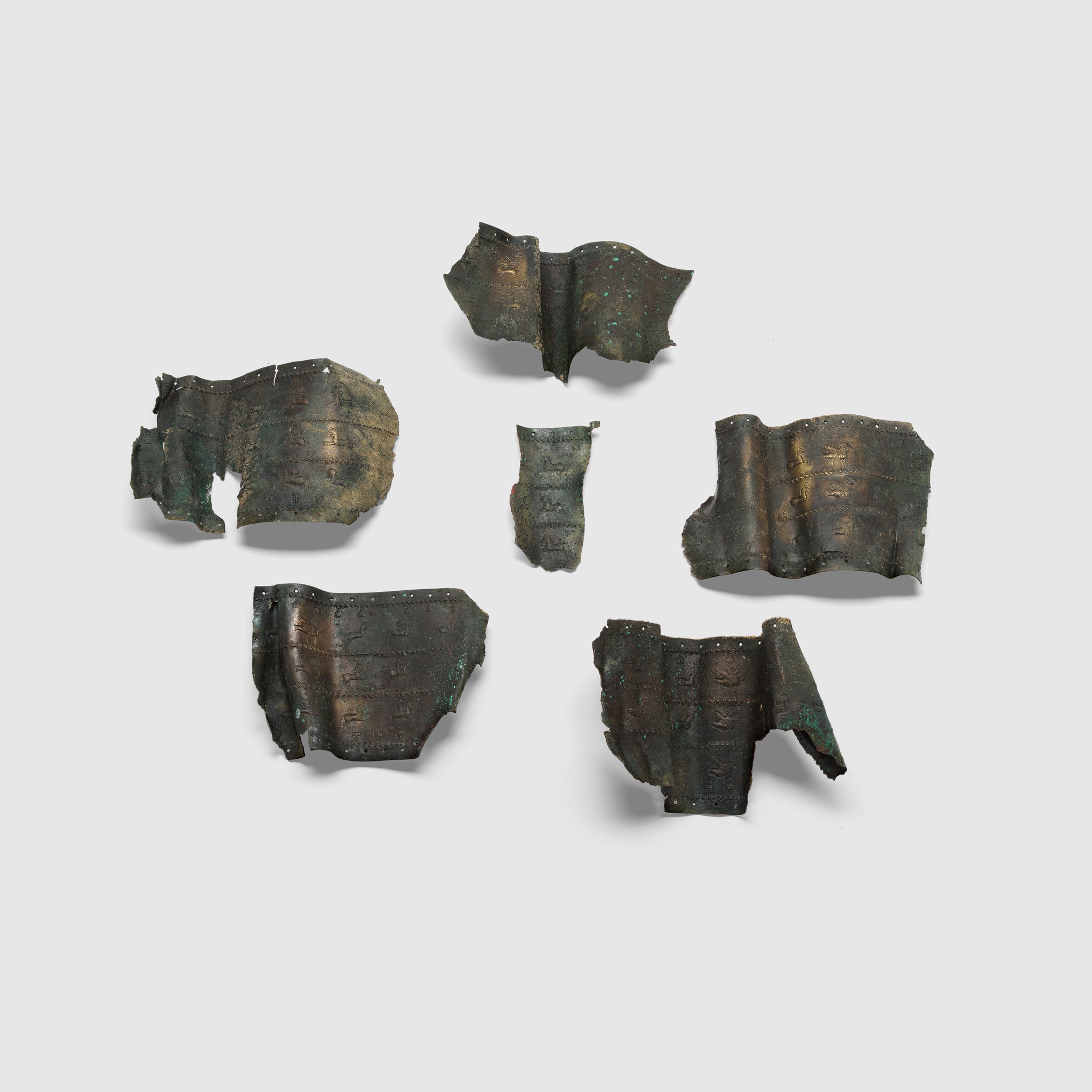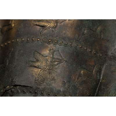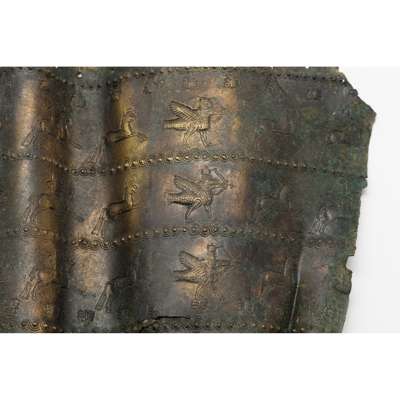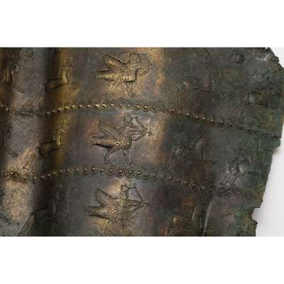 engraved bronze, each with incisions along the border for attachment to a leather backing, decorated with images from mythical scenes, goats, bulls and lions are hunted by otherwordly winged creatures (5)