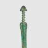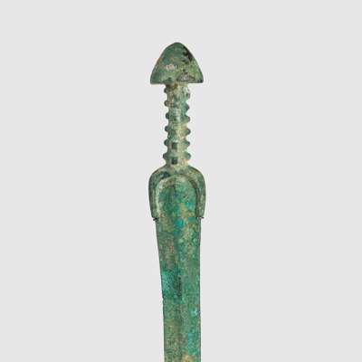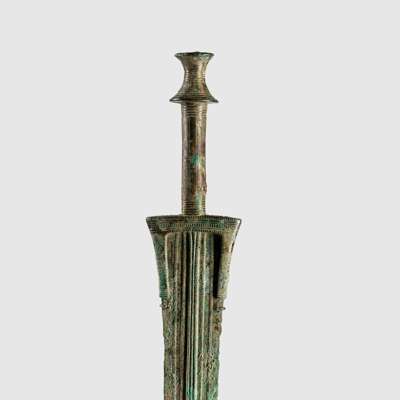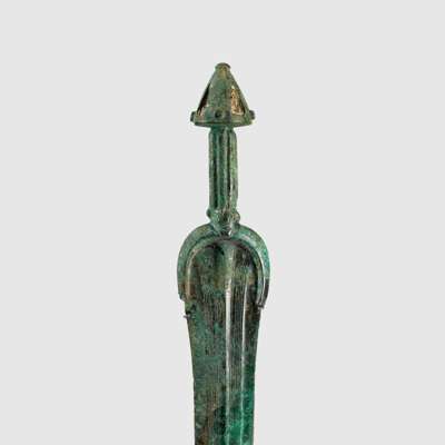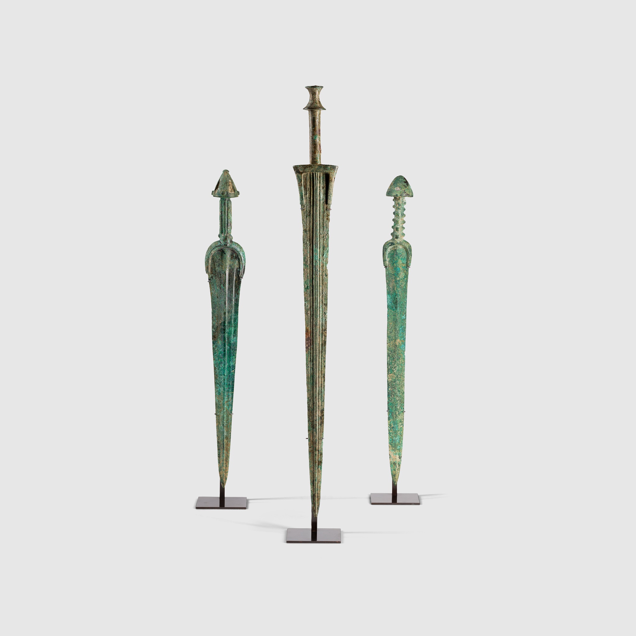 cast bronze, consisting of one sword with inlaid pommel and ribbed handle, the blade with central ridge; one sword with inlaid cone pommel, grooved handle and linear recesses running parallel to the line of the blade; the tallest sword with concave cylinder pommel, incised handle and squared guard (3)