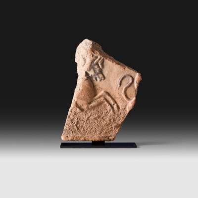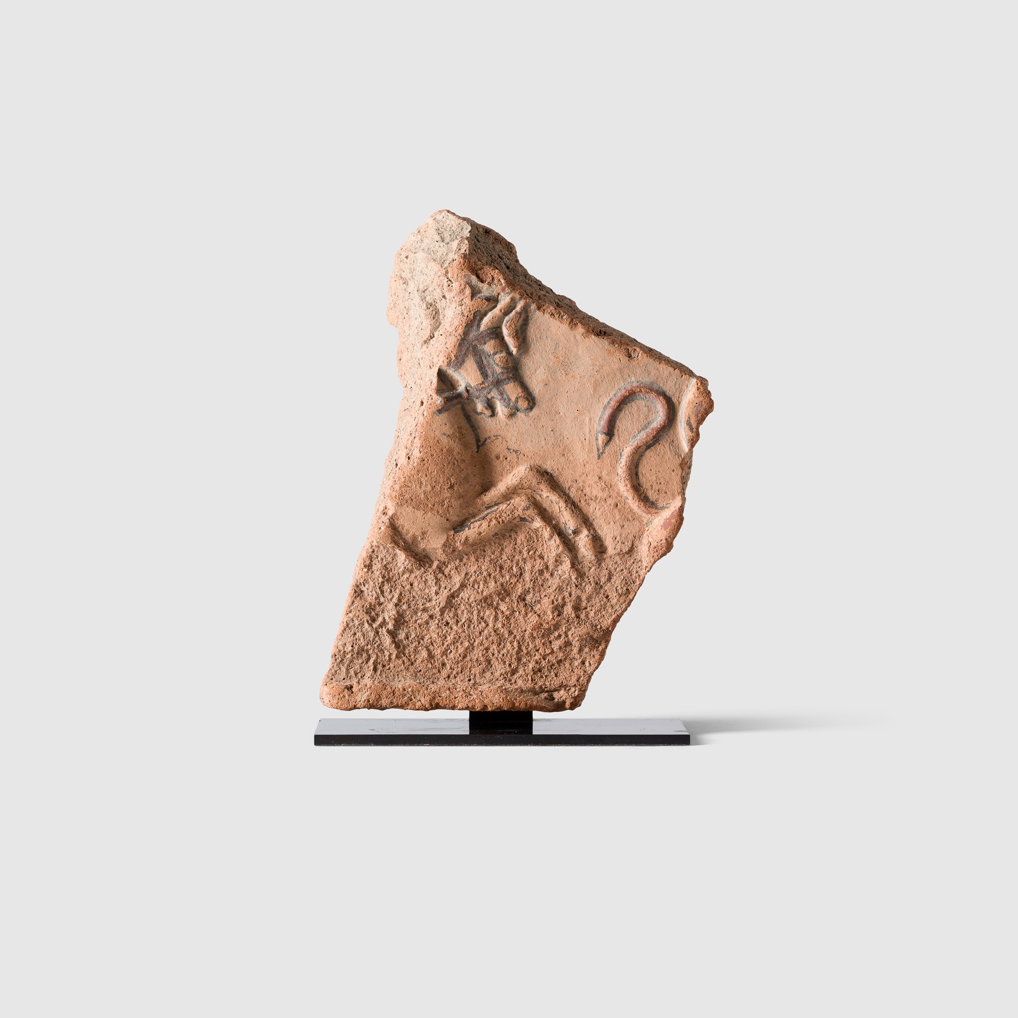 painted terracotta, decorated in raised relief with a depiction of a horse chasing a griffin, the mythical beasts curved tail and wing visible at the edge of the fragment, raised on a bespoke mount