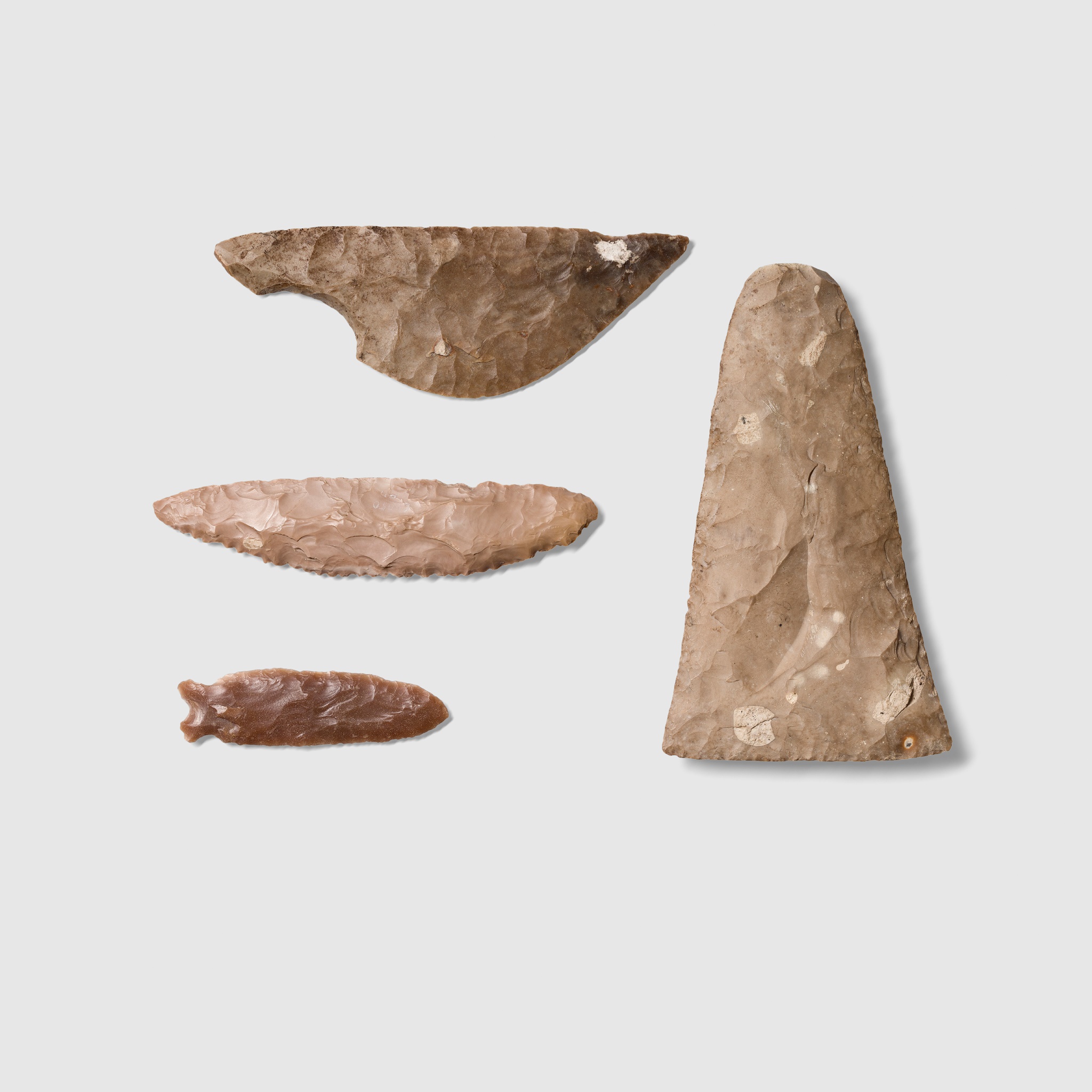 knapped flint, consisting of; one axehead, one spearhead and two scythe blades (4)