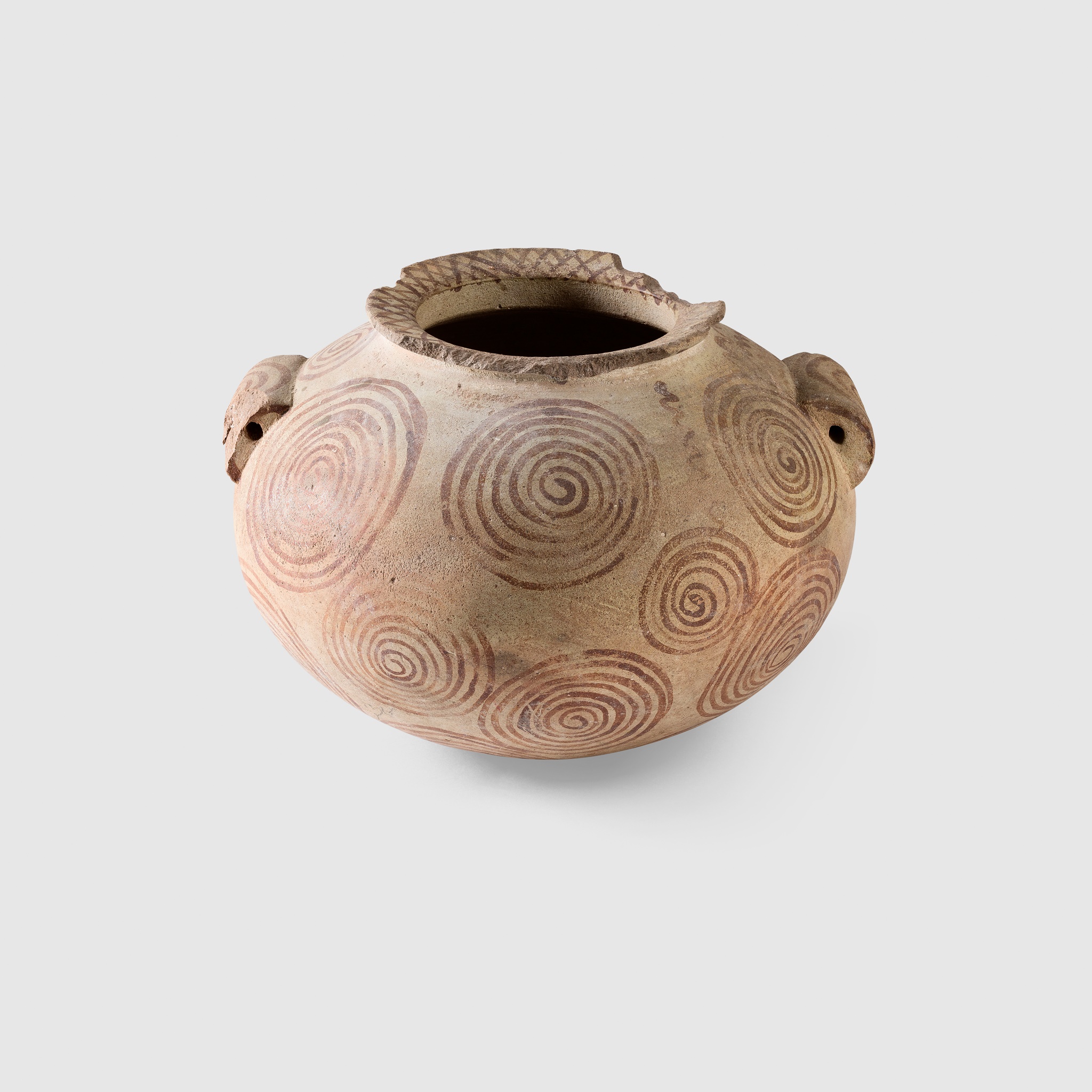 painted terracotta, sitting on a rounded base, of squat form with short neck and out-turned rim, dual strap handles, painted with concentric circles in deep red