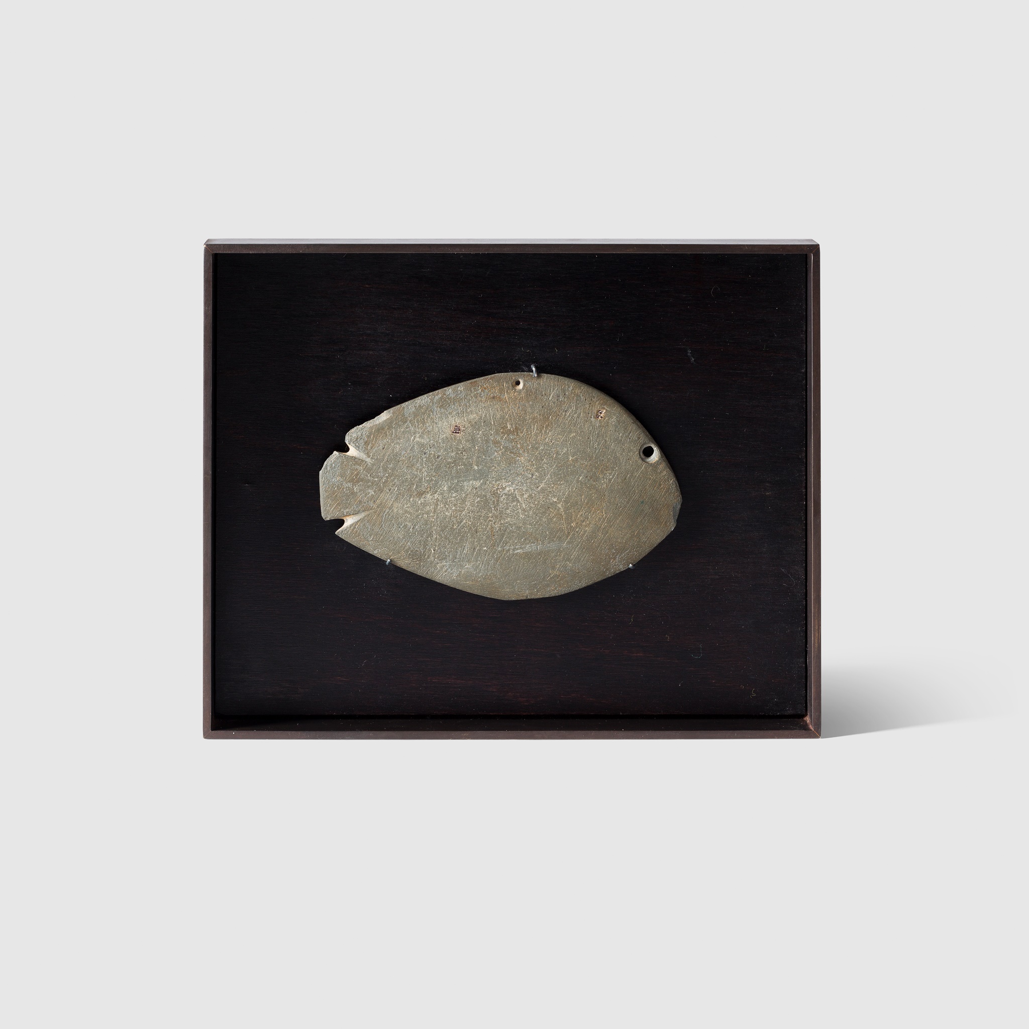 carved and polished schist, in the form of a fish, with a perforation to the eye and a suspension hole above, presented within a bronze and ebonised wood case