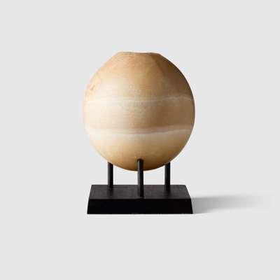 carved and polished banded alabaster, evoking the form of an ostrich egg, with a round mouth, presented on a bespoke mount