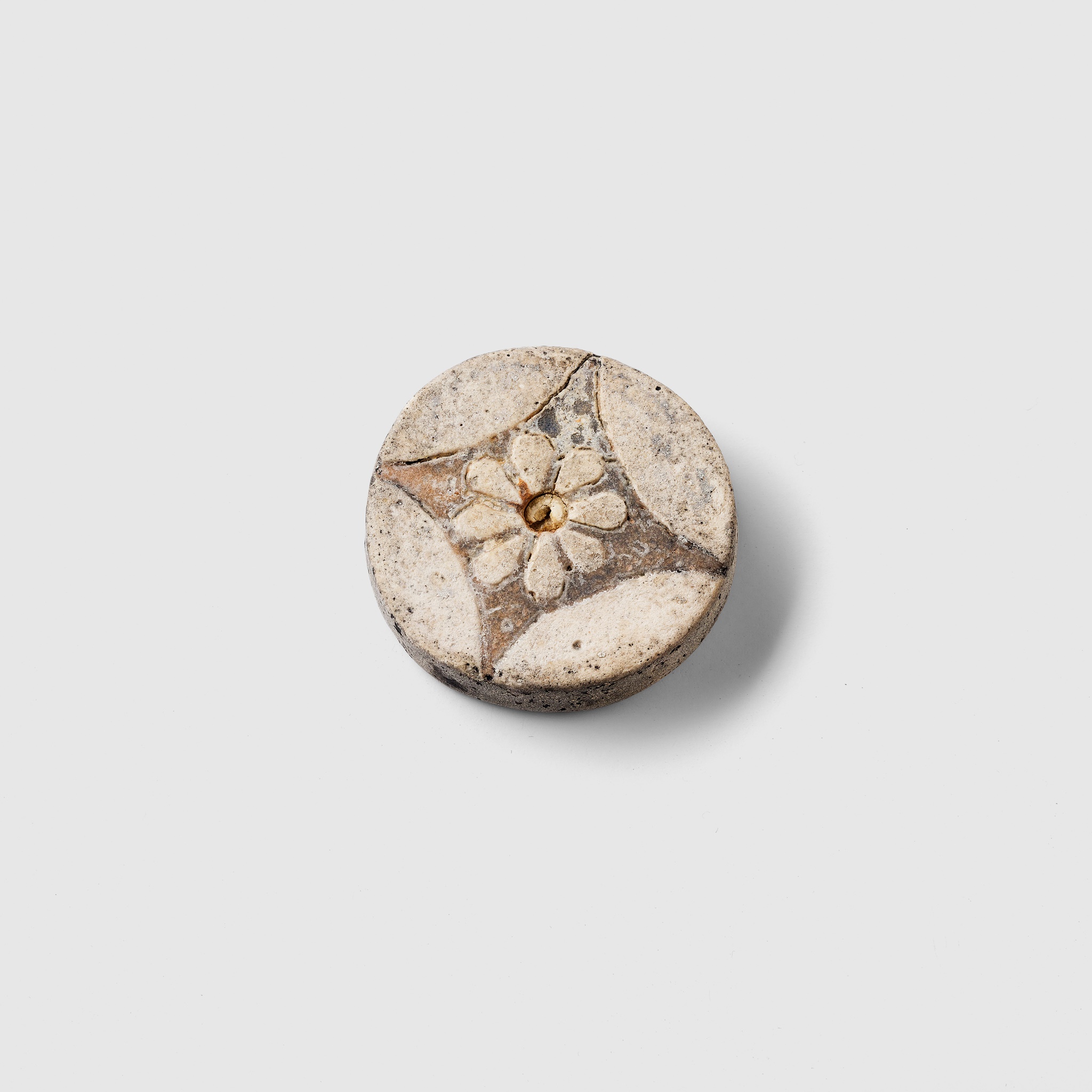 inlaid faience, depicting a flowering daisy, with eight white petals against a grey background