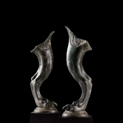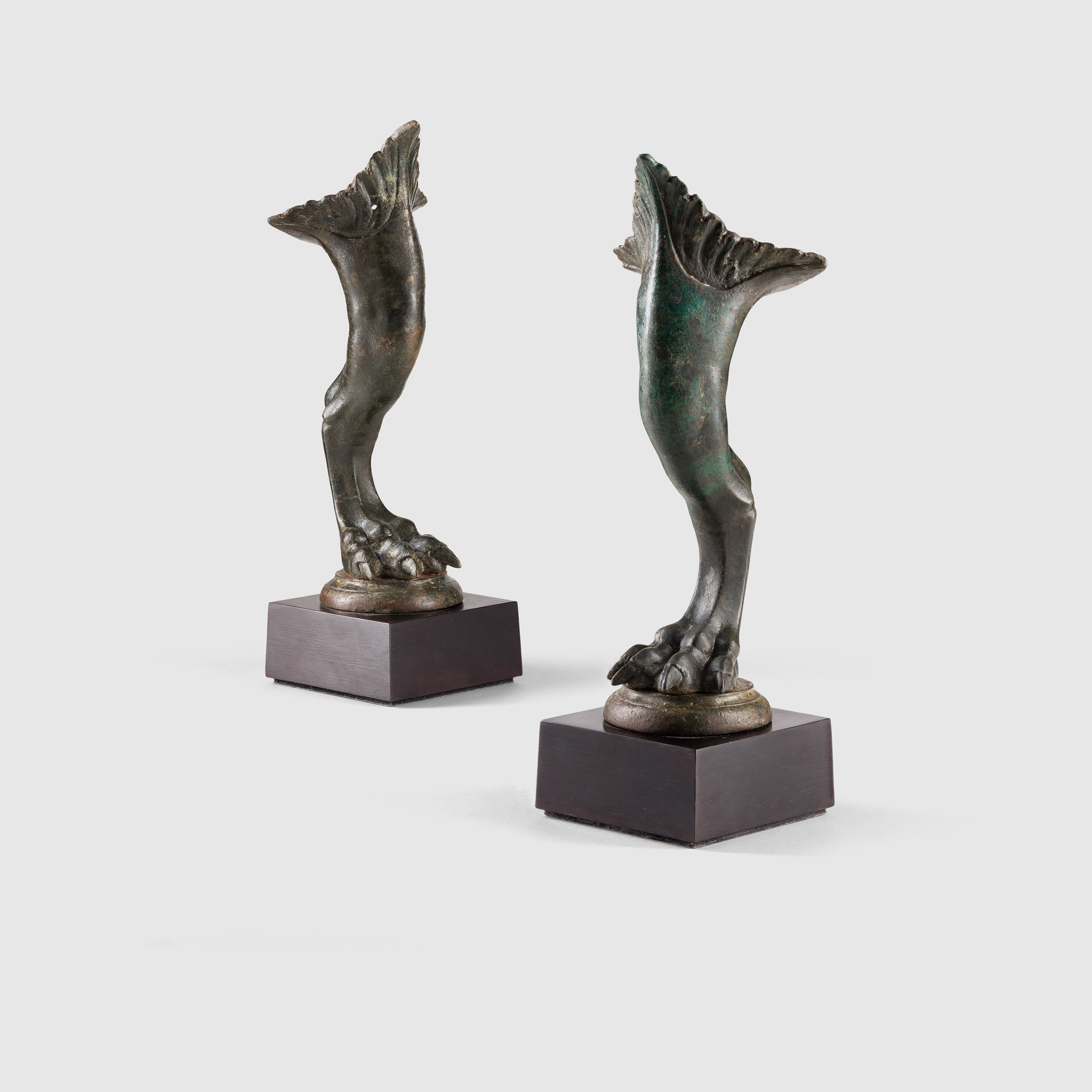 cast bronze, standing on a circular base, modelled in the form of griffins’ legs, the sinuous clawed feet displaying fine detail, the arched legs with well-defined musculature, the tops formed into acanthus leaves (2)