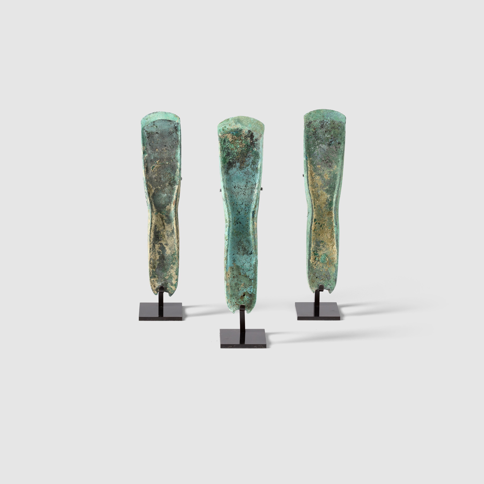 cast copper alloy, all with curved blades and short vertical flanges, raised on bespoke bronze mounts (3)
