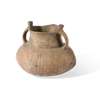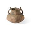 fired and impressed terracotta, sitting on a rounded base, the globular body decorated with incised decoration (some with remaining lime infill), the wide neck with two strap handles and anthromorphic finials above
