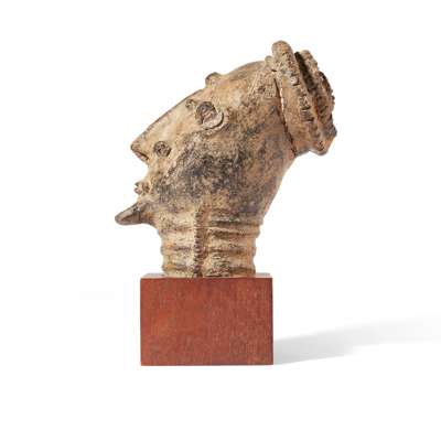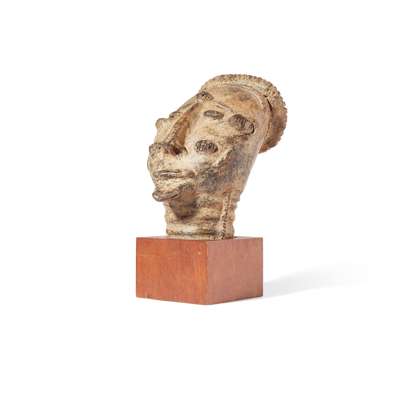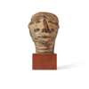 fired clay, covered in a coating of black plant extract, with incised eyes, long slender nose, raised scarification marks and small beard, shown with a distinctive ringed coiffure and raised on a bespoke mount with inventory number "2097"